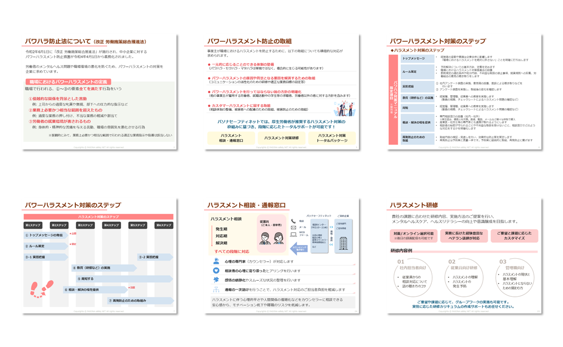 各種相談サービス(相談・通報窓口を含む)、研修サービス、ストレスチェックサービス、EAPサービス