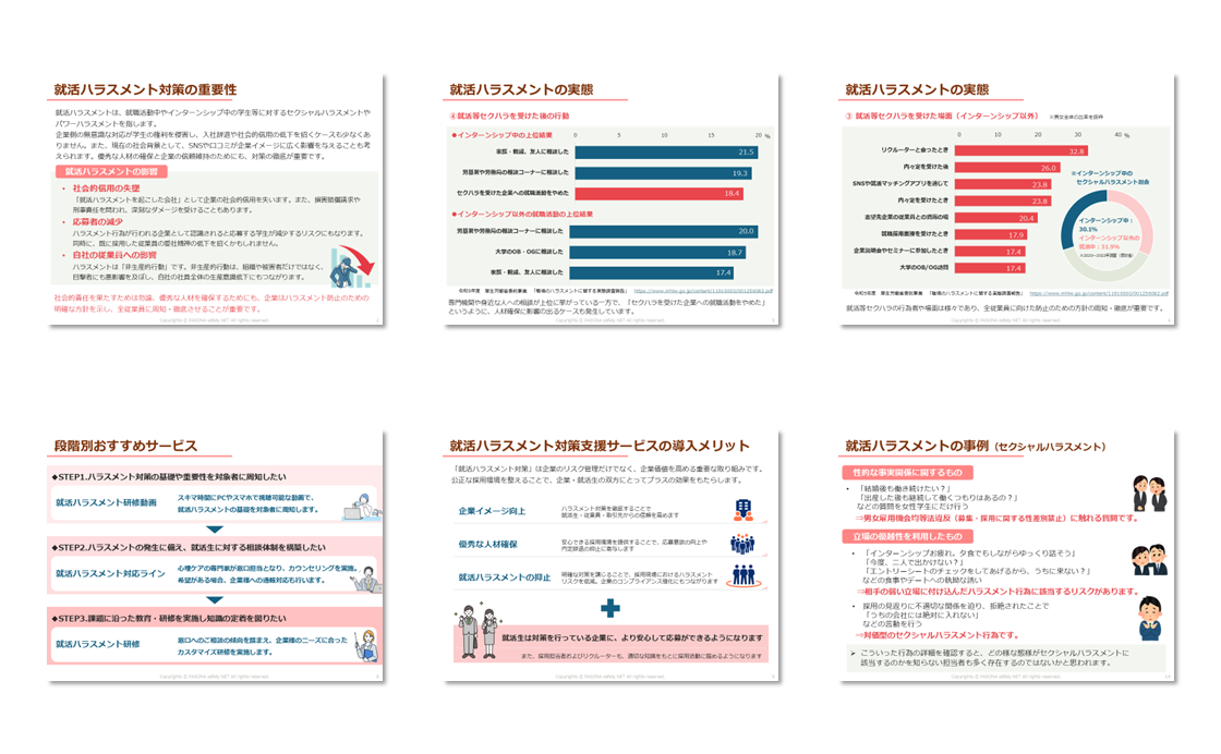 就活ハラスメントは、就職活動中やインターンシップ中の学生等に対するハラスメントを指します。企業側の無意識な対応が学生の権利を侵害し、入社辞退や社会的信用の低下につながります。本資料では、就活ハラスメントの現状と対策の必要性、弊社のご提供サービスについて解説しています。